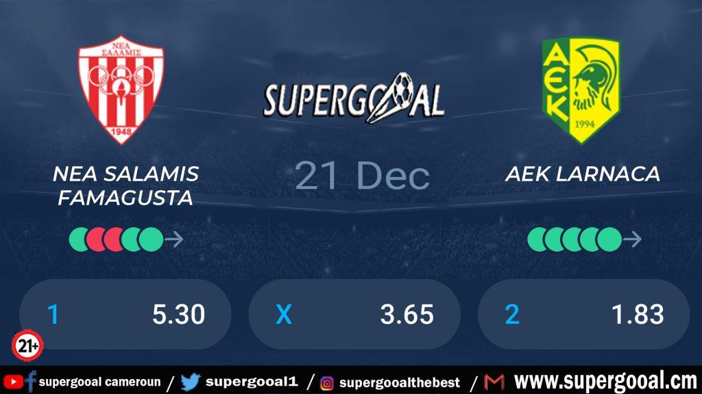 NEA SALAMINA FAMAGUSTA – AEK LARNACA est le match dans lequel vos plans pour cette fin d’année peuvent connaitre un meilleur sort. AEK LARNACA très bien parti pour prendre le dessus dans ce face à face ceci grâce à ses performances récentes et sa position dans le championnat. Avec sa cote de 1.61, le deuxième du championnat de Chypre a tout pour garder son fauteuil de dauphin et ainsi contrôler sereinement le leader dans cette compétition. Une rencontre donc l’objectif reste le même pour AEK LARNACA prendre match par match et attendre le faux de son concurrent direct. En face et évoluant à la maison NEA SALAMINA FAMAGUSTA devra aller chercher une bonne prestation et éviter une humiliation à domicile ce qui vous permettra de gagner un gros lot avec sa cote de 4.60.