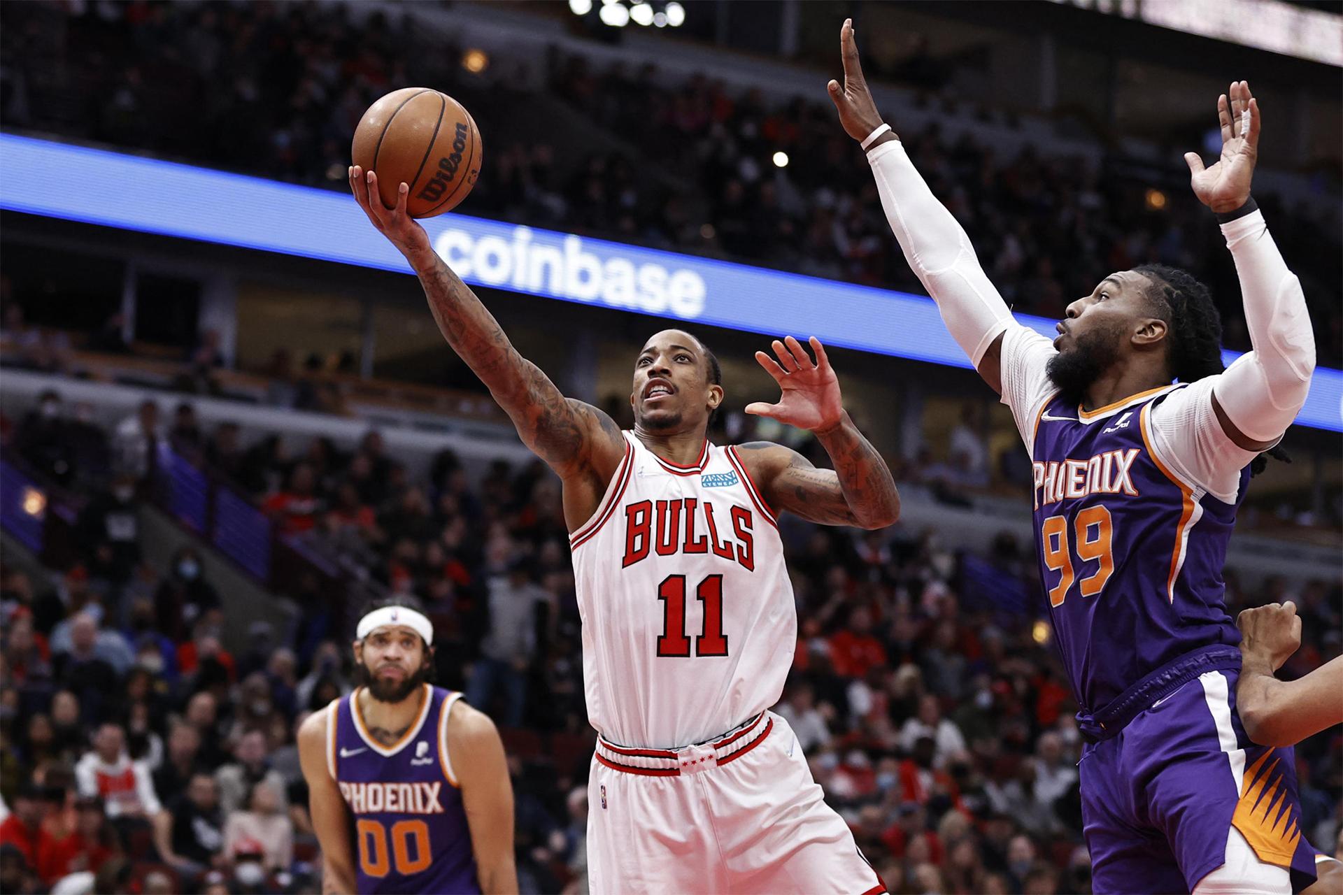 Feb 7, 2022; Chicago, Illinois, USA; Chicago Bulls forward DeMar DeRozan (11) goes to the basket against Phoenix Suns forward Jae Crowder (99) during the second half at United Center. Mandatory Credit: Kamil Krzaczynski-USA TODAY Sports