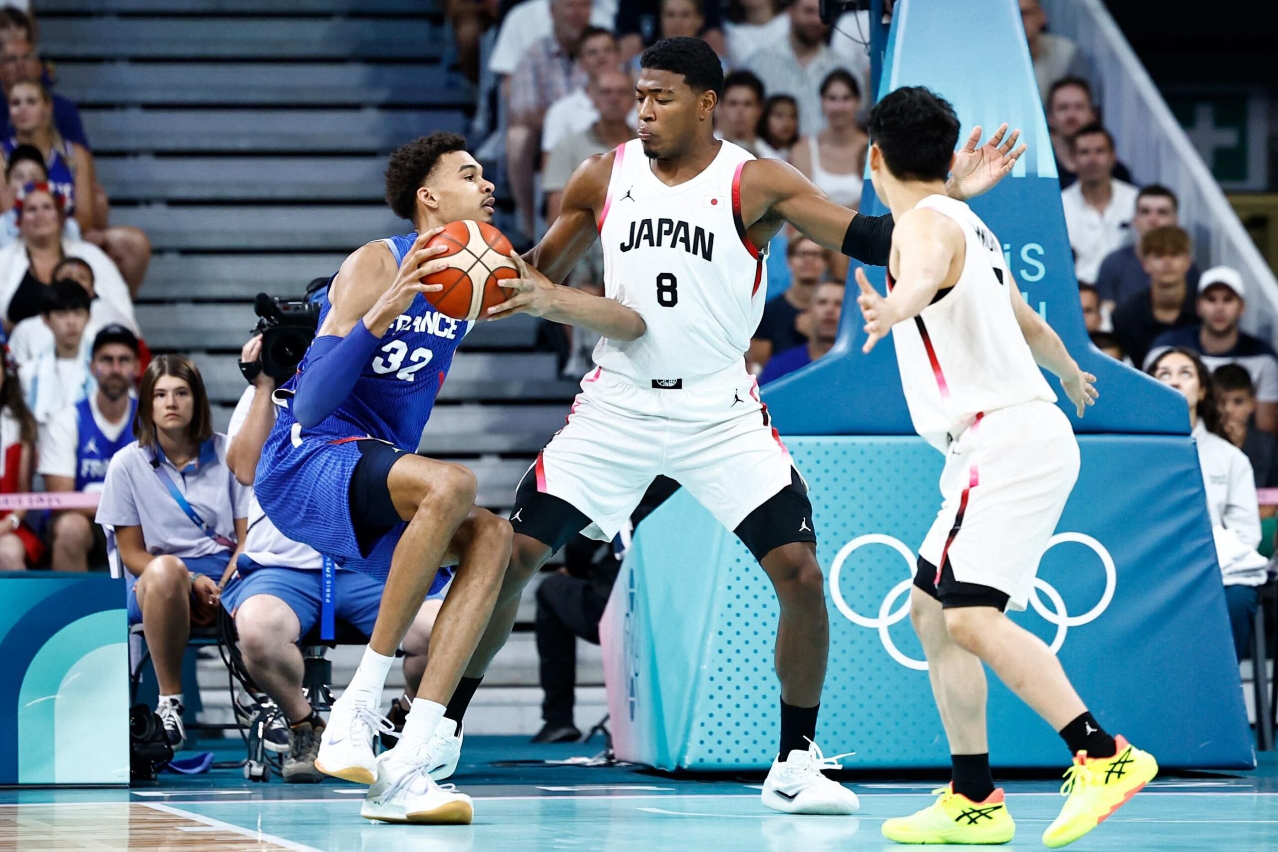 France’s #32 Victor Wembanyama challenges Japan’s #08 Rui Hachimura in the men’s preliminary round group B basketball match between Japan and France during the Paris 2024 Olympic Games at the Pierre-Mauroy stadium in Villeneuve-d’Ascq, northern France, on July 30, 2024. (Photo by Sameer Al-Doumy / AFP)
